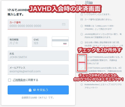 - 決済画面にある提携サイトの同時入会チェックを必ず2か所外すこと